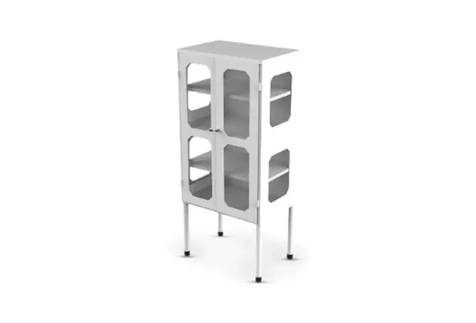 Com duas portas equipadas com visores em acrílico transparente, o armário combina funcionalidade e design sofisticado, contribuindo para a valorização do ambiente clínico.