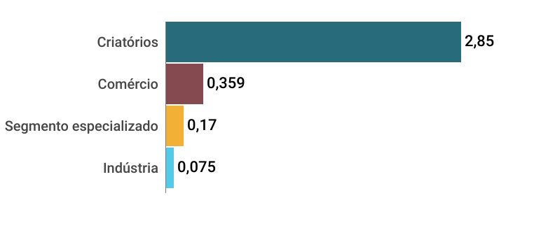 Ainda segundo o levantamento, o mercado pet brasileiro é responsável por mais de 3,4 milhões de postos de trabalho. Os criatórios concentram a maior parte desses empregos, com 2,85 milhões de profissionais. O comércio responde por 359 mil vagas, enquanto o segmento especializado emprega 170 mil pessoas e a indústria, 75 mil.