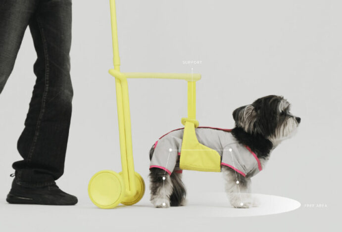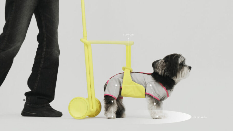 O acessório para mobilidade de cães idosos conta com um sistema de altura ajustável e uma cinta de tecido magnético adaptável aos movimentos do pet. Um mecanismo de freio também permite que o tutor suspenda o movimento quando necessário.