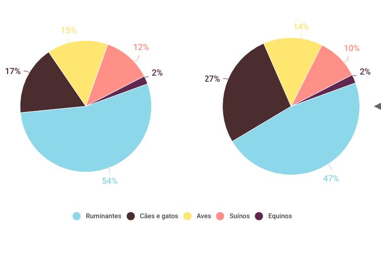 Embora ainda não sejam majoritários, cães e gatos vêm sendo os motores da transformação da saúde animal. Em dez anos, a representatividade desse grupo no faturamento saltou de 17% para 27%. Juntas, essas espécies reduziram em 17 pontos percentuais a distância para os ruminantes.