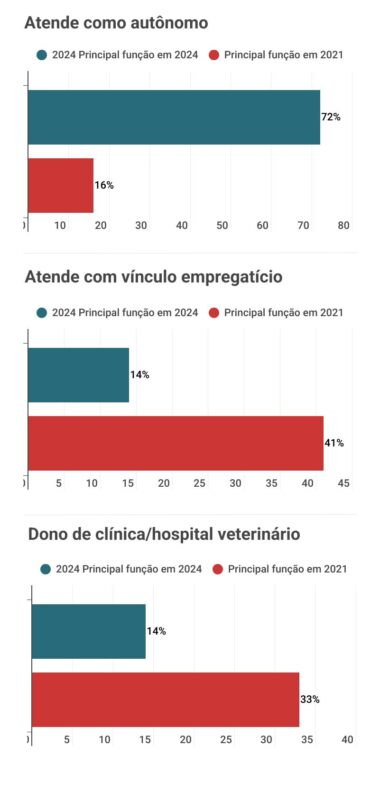 A relação empregatícia no mercado de trabalho para veterinários mudou significativamente durante os anos. Em 2021, 41% dos profissionais tinham como função primária o exercício da veterinária sob um vínculo empregatício. O número de autônomos era pouco superior a um quarto do universo. Já no ano passado, 72% passaram a atuar no modelo autônomo, seja com ou sem contrato de prestação de serviços.