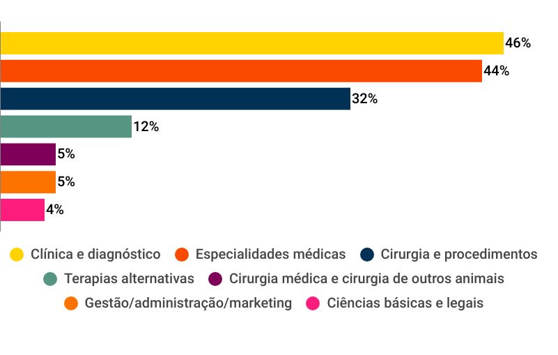 Além da graduação em medicina veterinária, o profissional vem buscando formação complementar para atuar em áreas específicas da medicina veterinária. Atualmente, 66% dos profissionais têm ou estão cursando uma especialização ou pós-graduação.