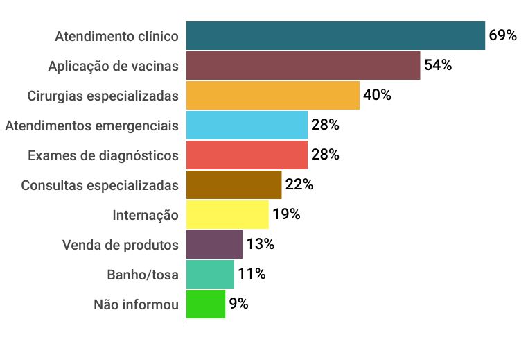 Por fim, o levantamento revela que o atendimento clínico é a principal fonte de faturamento para 69% dos veterinários. Em seguida, aparecem aplicação de vacinas (54%) e as cirurgias especializadas (40%).