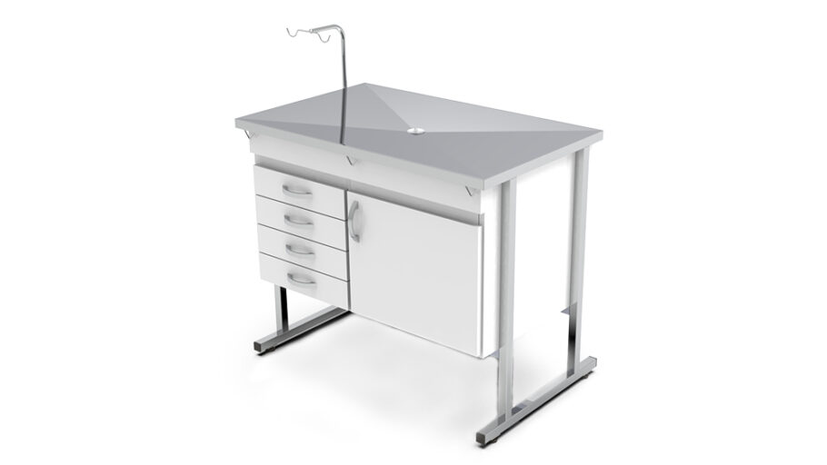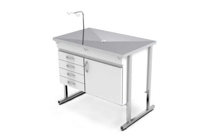 A mesa é construída em aço inox, garantindo alta durabilidade e resistência à corrosão. O lançamento conta com um gabinete com uma porta e três gavetas, além de acessórios como suporte de soro removível com ajuste de altura por manípulo lateral e balde de alumínio com capacidade de cinco litros.