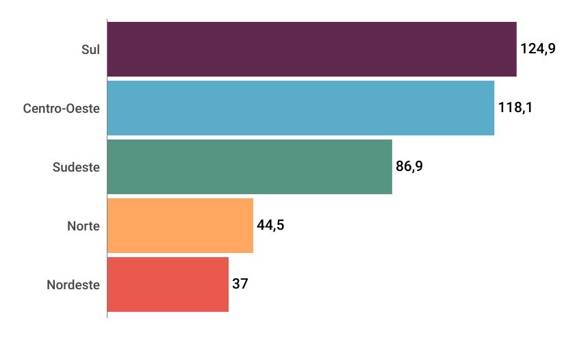 O total de veterinários por 100 mil habitantes é ainda mais expressivo quando a análise é feita por região do Brasil. Destacam-se especialmente o Sul e o Centro-Oeste, respectivamente com 124,9 e 118,1 profissionais. Esses indicadores revelam um profundo fosso em relação ao eixo Norte-Nordeste.