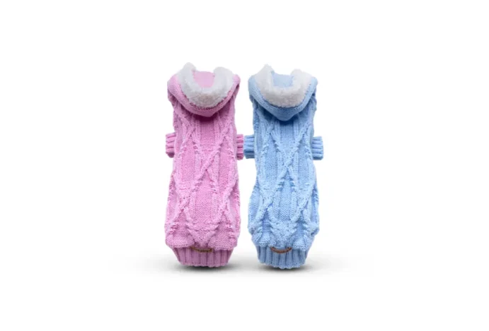 Trançado e com capuz com detalhe em sherpa (pelinho de ovelha), a roupa combina fofura e proteção, sendo ideal para o inverno. Estão disponíveis nas cores azul e rosa e sua grade de tamanhos vai do P ao G.