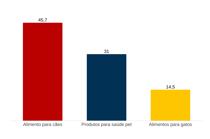 Estudo da Neotrust revela que o e-commerce pet faturou R$ 1,3 bilhão de janeiro a março de 2023. Os alimentos destinados aos cães lideram o mercado de vendas online, representando 45,7% do faturamento nos primeiros três meses de 2024. Em seguida, aparecem os produtos para a saúde dos animais de estimação e os alimentos destinados aos gatos, com evolução de 31,4% e 14,5%, respectivamente.
